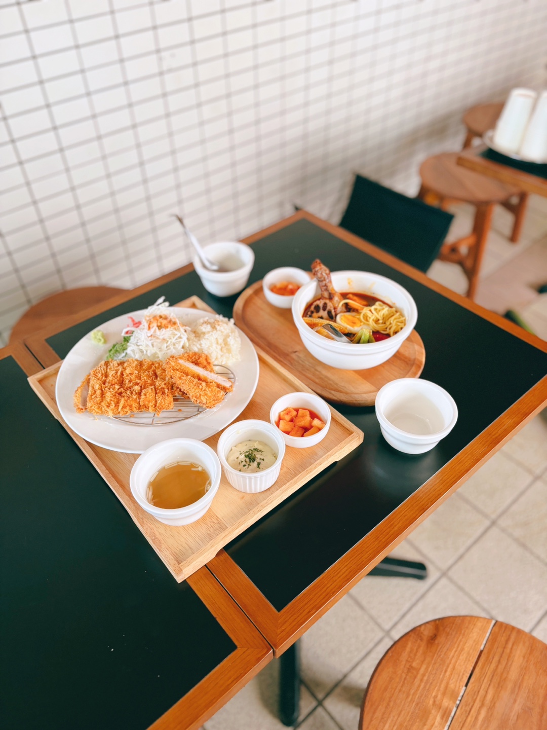 삿포로식 수프카레 라멘과 치킨카츠를 주문했습니다. 제육덮밥도 너무 궁금했지만 다음에 먹기로 했네요. 점심 메뉴 외에도 일본식 안주 종류가 다양했어요. 안주 가격은 비싸지 않기 때문에 시원한 술 한잔 하면서 다양하게 맛볼 수 있습니다.