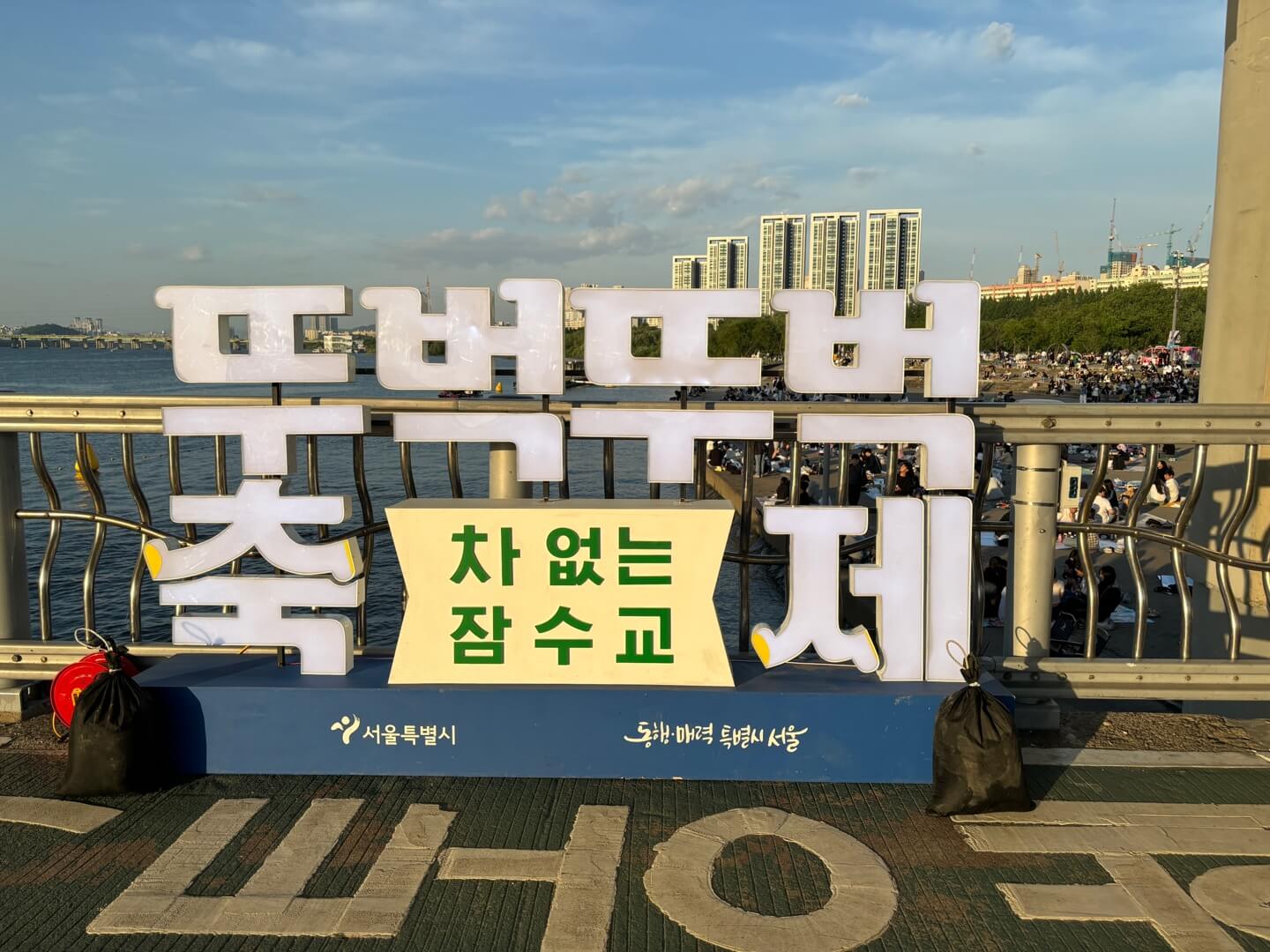 한강공원에는 다양한 푸드트럭이 있으며 잠수교에는 플리마켓, 포토존, 힐링존 등 다양한 이벤트가 진행됩니다. 특히 멍때리기 대회가 열립니다.