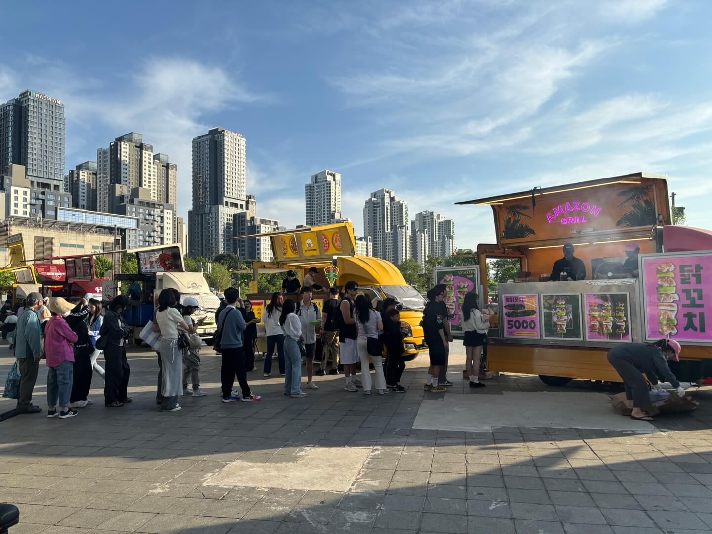 푸드트럭은 반포방향에 10대정도 있습니다. 피자, 닭꼬치, 스테이크, 츄로스 등 다양한 먹거리가 준비되어 있습니다. 인기있는 먹거리는 웨이팅이 길어서 시간이 걸릴 수 있습니다. 저녁시간에는 한강에서 일몰을 볼 수 있습니다. 힐링을 할 수 있는 텐트와 힐링존이 있으니 즐거운 경험을 하실 수 있습니다.